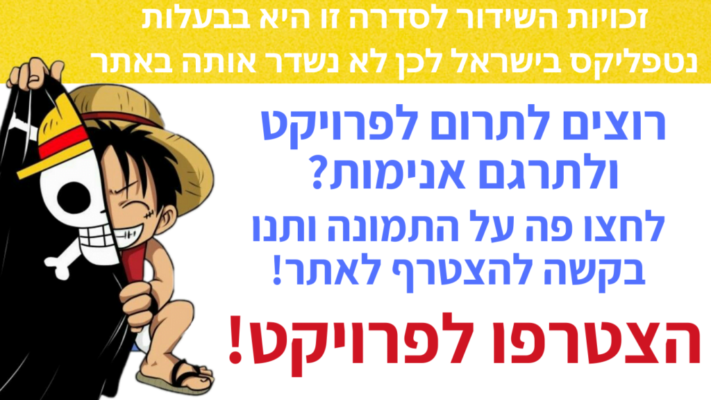 אתר זה הוא ללא מטרת רווח ואינו מאחסן קבצים בשרת שלו. כל הפרקים מסופקים על ידי צדדים שלישיים שאינם קשורים. אם תרצו שנסיר תוכן ספציפי או שיש פגיעה מסוימת, צרו איתנו קשר animeisraelweb@gmail.com ונענה לבקשה במהירות.