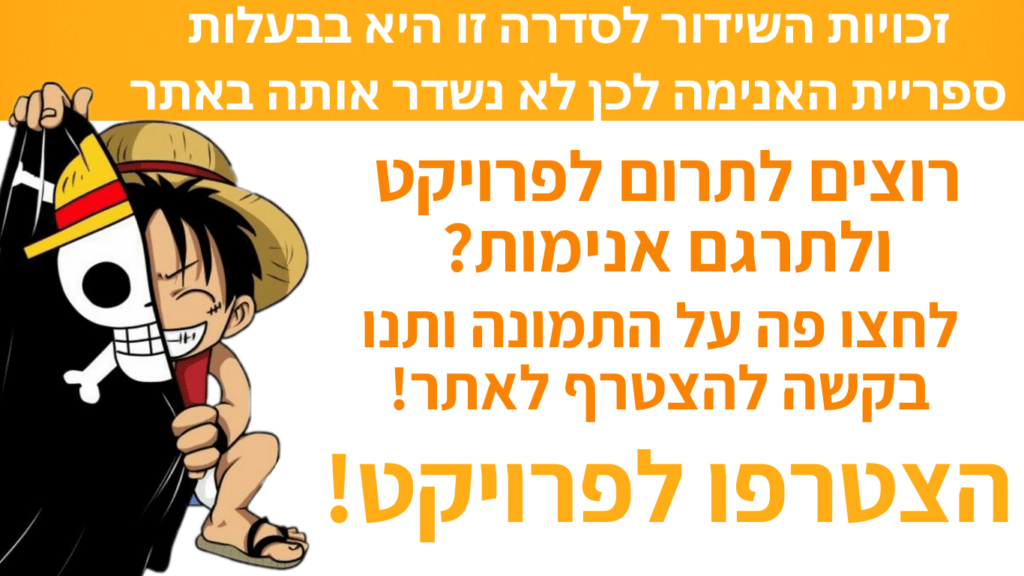 אתר זה הוא ללא מטרת רווח ואינו מאחסן קבצים בשרת שלו. כל הפרקים מסופקים על ידי צדדים שלישיים שאינם קשורים. אם תרצו שנסיר תוכן ספציפי או שיש פגיעה מסוימת, צרו איתנו קשר animeisraelweb@gmail.com ונענה לבקשה במהירות.